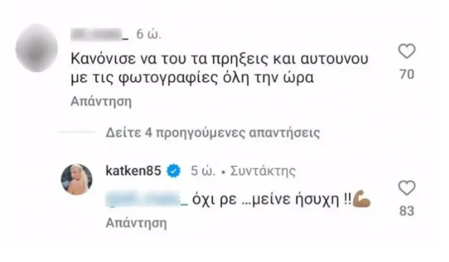 Μία ακόλουθος της Κατερίνας, ωστόσο, επέλεξε να σχολιάσει αρνητικά μια από τις φωτογραφίες της από το Παρίσι: «Κανόνισε να του τα πρήξεις και αυτουνού με τις φωτογραφίες όλη την ώρα». Η Κατερίνα δεν άφησε το σχόλιο να περάσει απαρατήρητο και απάντησε άμεσα: «Όχι ρε…μείνε ήσυχη!!».