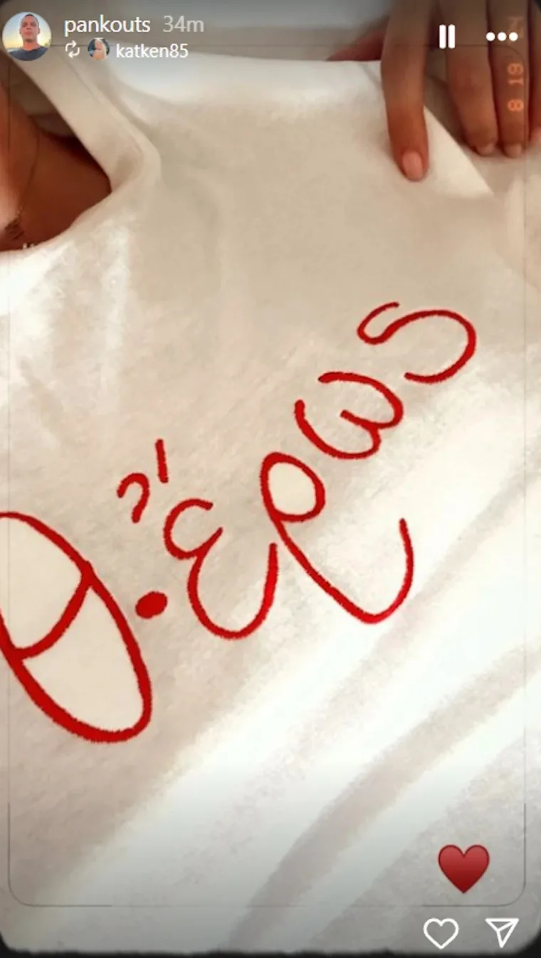 Η εντυπωσιακή παρουσιάστρια, αφού προέβη σε μια τρυφερή εξομολόγηση των συναισθημάτων της, επέλεξε να εκφράσει τη στοργή της με έναν ιδιαίτερο τρόπο. Φόρεσε ένα λευκό μπλουζάκι, στο οποίο ήταν αποτυπωμένη η λέξη «θ-έρως», και επισημοποίησε αυτήν τη δήλωση αφιερώνοντάς την στον σύντροφό της, Παναγιώτη Κουτσουμπή, στον οποίο και τον έδωσε ταγκάροντας τον δημοσίως.