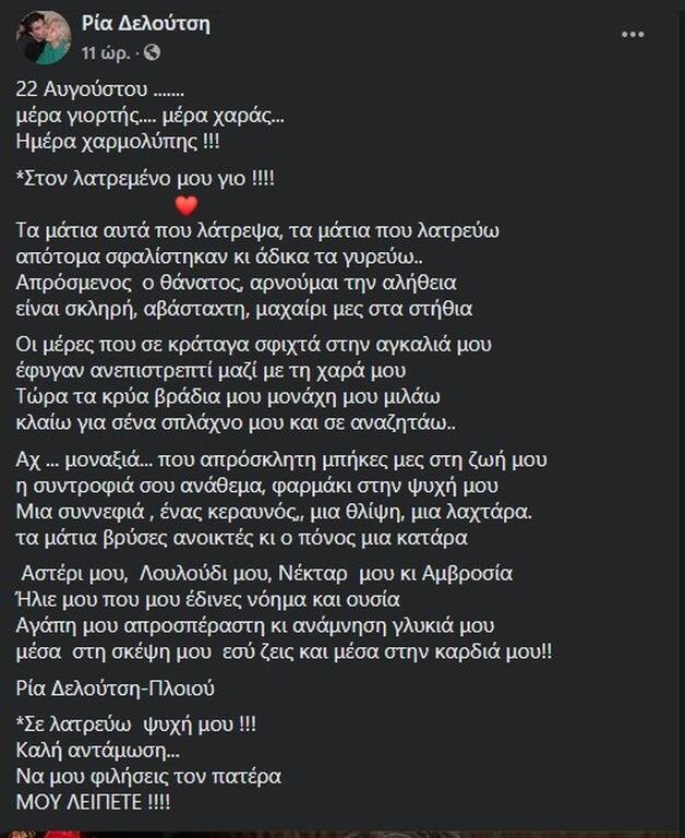 Ρία Δελούτση: Η γνωστή ηθοποιός συγκίνησε πολύ κόσμο, με την ανάρτησή της. Εκείνη είχε σχέση με το χαμό του γιου της, ο οποίος έλαβε χώρα στις 22 Αυγούστου. Η Ελληνίδα ηθοποιός έχει μεγάλο πόνο για τον, Γιώργο της. Ο γιος της σκοτώθηκε ακαριαία, καθώς μετέβαινε με τη μηχανή του στην εργασία του. Από εκεί και πέρα, ο σύζυγός της και επίσης ηθοποιός, Βαγγέλης Πλοίος, με τον οποίο είχαν αποκτήσει τον Γιώργο έφυγε από τη ζωήν τον περασμένο Φλεβάρη.