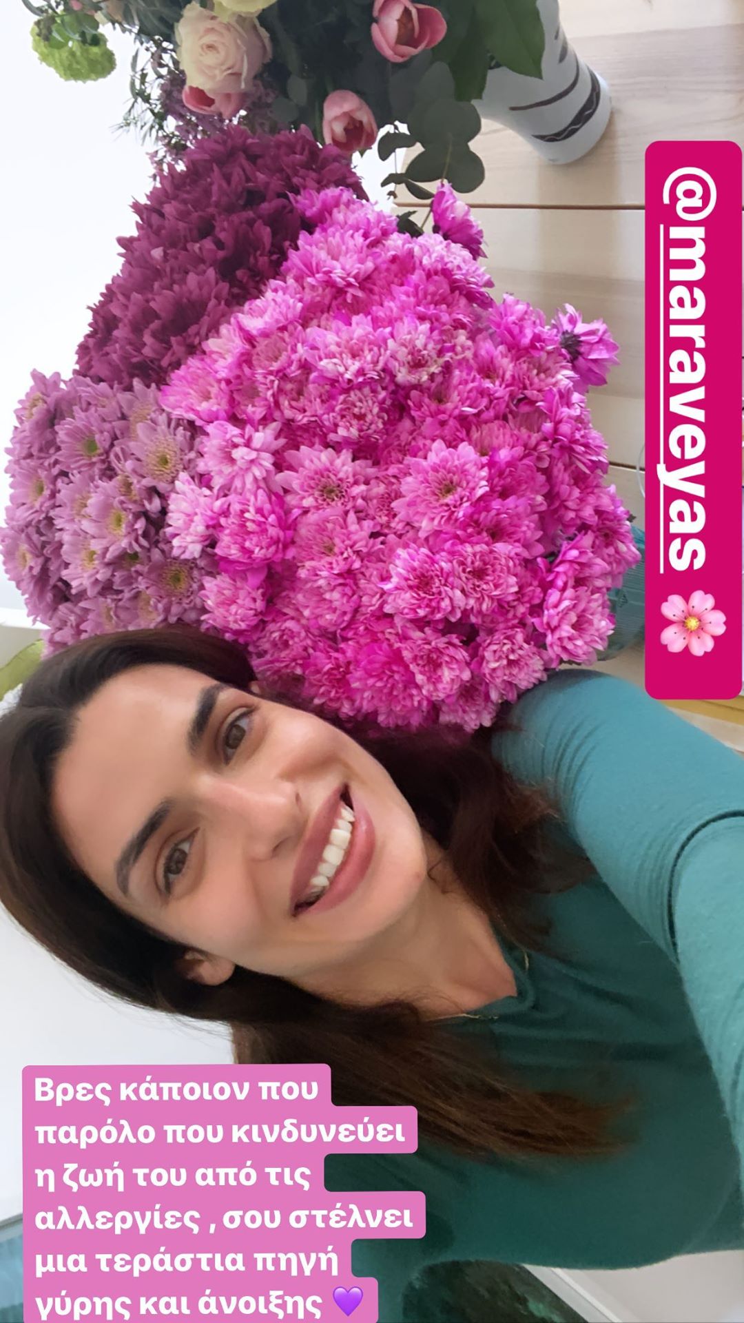 Όπως αποκάλυψε η Ελληνίδα ηθοποιός με instastory, ο αγαπημένος τραγουδιστής της δώρισε μία τεράστια ανθοδέσμη. Η συγκεκριμένη ανθοδέσμη είχε ροζ λουλούδια. Μάλιστα, αυτό το έκανε παρά τις αλλεργίες που τον ταλαιπωρούν λόγω της Άνοιξης. «Βρες κάποιον που παρόλο που κινδυνεύει η ζωή του από τις αλλεργίες σου στέλνει μια τεράστια πηγή γύρης και άνοιξης». Αυτό έγραψε στο Instastory που πραγματοποίησε, η εορτάζουσα ηθοποιός. Η ίδια ήταν εμφανώς ενθουσιασμένη από την κίνηση του συντρόφου της και γνωστού τραγουδιστή, Κώστα Μαραβέγια.