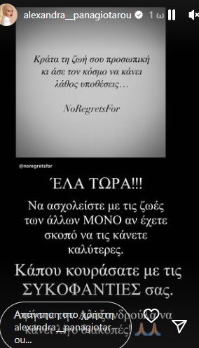 «Έλα τώρα!!! Να ασχολείστε με τις ζωές των άλλων μόνο αν έχετε σκοπό να τις κάνετε καλύτερες. Κάπου κουράσατε με τις συκοφαντίες σας. Αφήστε την Αλεξανδρούλα να κάνει λίγο διακοπές», έγραψε αφού αυτό το τριήμερο βρίσκεται στη Μύκονο.