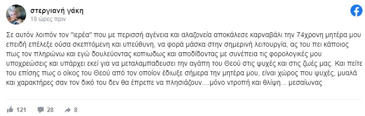 «Σε αυτόν λοιπόν τον ”ιερέα” που με περισσή αγένεια και αλαζονεία αποκάλεσε καρναβάλι την 74χρονη μητέρα μου επειδή επέλεξε ούσα σκεπτόμενη και υπεύθυνη, να φορά μάσκα στην σημερινή λειτουργία, ας του πει κάποιος πως τον πληρώνω και εγώ δουλεύοντας κοπιωδώς και αποδίδοντας με συνέπεια τις φορολογικές μου υποχρεώσεις και υπάρχει εκεί για να μεταλαμπαδεύσει την αγάπη του Θεού στις ψυχές και στις ζωές μας.