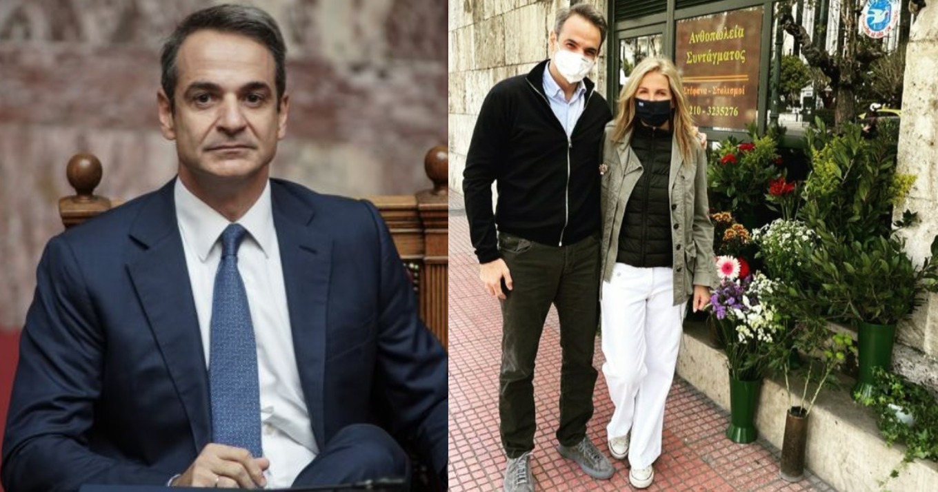 Μπροστά στα ιστορικά λουλουδάδικα της Βουλής, επί της λεωφόρου Βασιλίσσης Σοφίας, φωτογραφήθηκαν το Σάββατο (27.03.2021) ο Κυριάκος Μητσοτάκης και η σύζυγός του, Μαρέβα Γκραμπόφσκι – Μητσοτάκη.