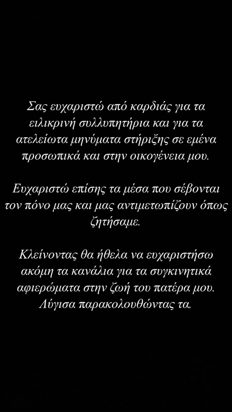«Σας ευχαριστώ από καρδιάς για τα ειλικρινή συλλυπητήρια και για τα ατελείωτα μηνύματα στήριξης σε εμένα προσωπικά και στην οικογένειά μου. Ευχαριστώ επίσης τα Μέσα που σέβονται τον πόνο μας και μας αντιμετωπίζουν όπως ζητήσαμε», ανέφερε χαρακτηριστικά.