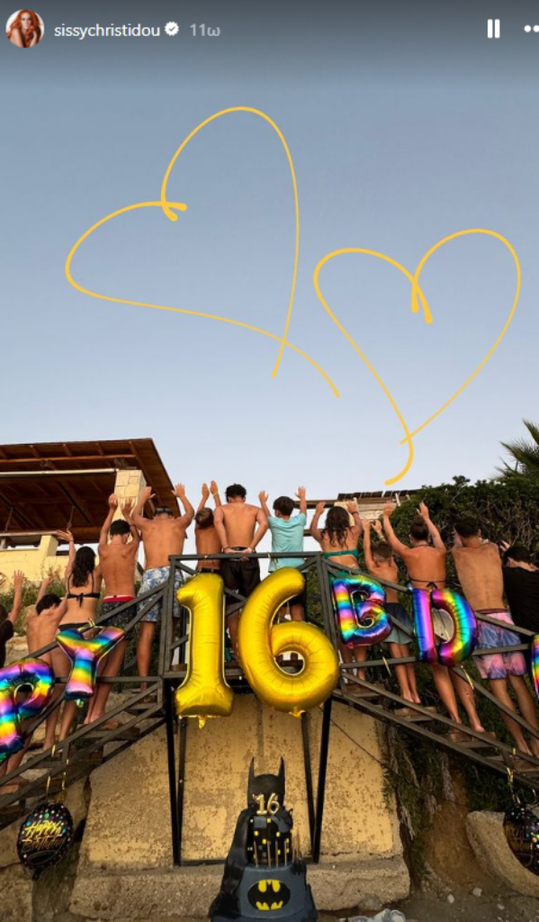 Εκτός από το βίντεο, η Σίσσυ Χρηστίδου ανάρτησε και μια φωτογραφία, μέσω story στο Instagram, που δείχνει τον γιο της με την παρέα του να ποζάρουν φορώντας το μαγιό τους και έχοντας γυρισμένη την πλάτη στην κάμερα. Στο κέντρο, βρίσκονται τα μεγάλα μπαλόνια με τους αριθμούς 1 και 6.
