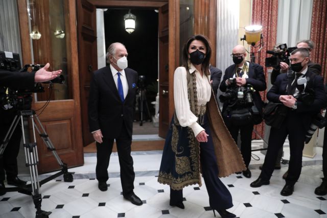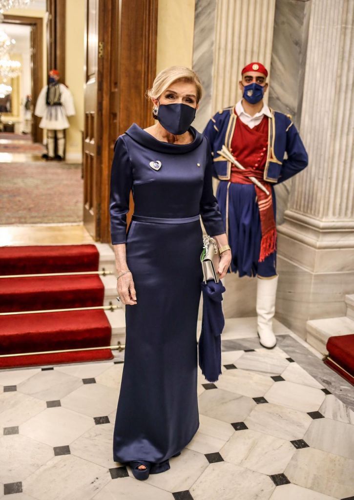 Πανέμορφη και λαμπερή, η Μαρέβα Μητσοτάκη, αλλά εξίσου εντυπωσιακή και η Γιάννα Αγγελοπούλου. Με έμπνευση από την Ελλάδα είναι και η εμφάνιση της προέδρου της Επιτροπής «Ελλάδα 2021», Γιάννας Αγγελοπούλου. Με μπλε παντελόνα και γόβες στον ίδιο χρωματισμό, η Γιάννα Αγγελοπούλου επέλεξε ένα ιδιαίτερο λευκό πουκάμισο με όγκο στα μανίκια και παραδοσιακό αμάνικο επενδύτη.
