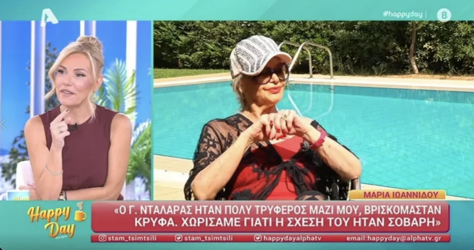 Στην εκπομπή “Happy Day” σήμερα το πρωί (15/10), προβλήθηκε μια εκτενής συνέντευξη της Μαρίας Ιωαννίδου στον Alpha. Η γνωστή ηθοποιός και χορεύτρια μίλησε για διάφορες πτυχές της ζωής της, μεταξύ αυτών και για τη σχέση της με τον Γιώργο Νταλάρα. Αποκάλυψε, μάλιστα, πως κατά την περίοδο που ήταν μαζί, και οι δύο είχαν παράλληλες σχέσεις με άλλους.