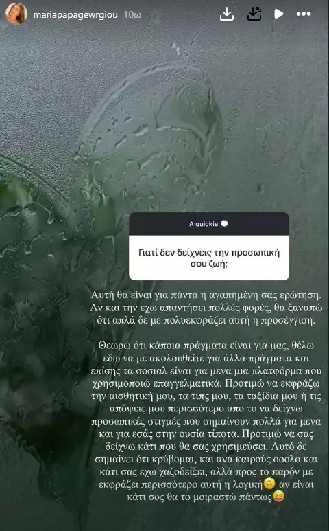 Η Μαρία Παπαγεωργίου, μάλιστα, μέσα από μια «συνεδρία» ερωτήσεων και απαντήσεων (Q&A) στο Instagram, εξήγησε τους λόγους για τους οποίους επιλέγει να μην αποκαλύπτει πολλά στοιχεία σχετικά με την προσωπική της ζωή. Με αυτή την τοποθέτηση, τόνισε την επιθυμία της να διατηρήσει μια διακριτική στάση σε θέματα που αφορούν τις πιο ιδιωτικές της πτυχές, προστατεύοντας την προσωπική της ευτυχία μακριά από τη δημόσια σφαίρα.