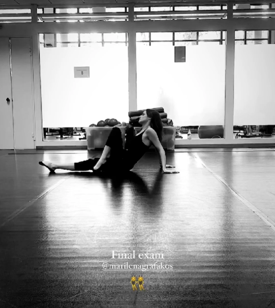 Η Μαρία ντύθηκε στα μαύρα με κορμάκι, παντελόνι φόρμας, κορμάκι και παπούτσια μπαλέτου και έκανε το χορευτικό της στο πάτωμα. “Τελική εξέταση”, έγραψε στη λεζάντα.