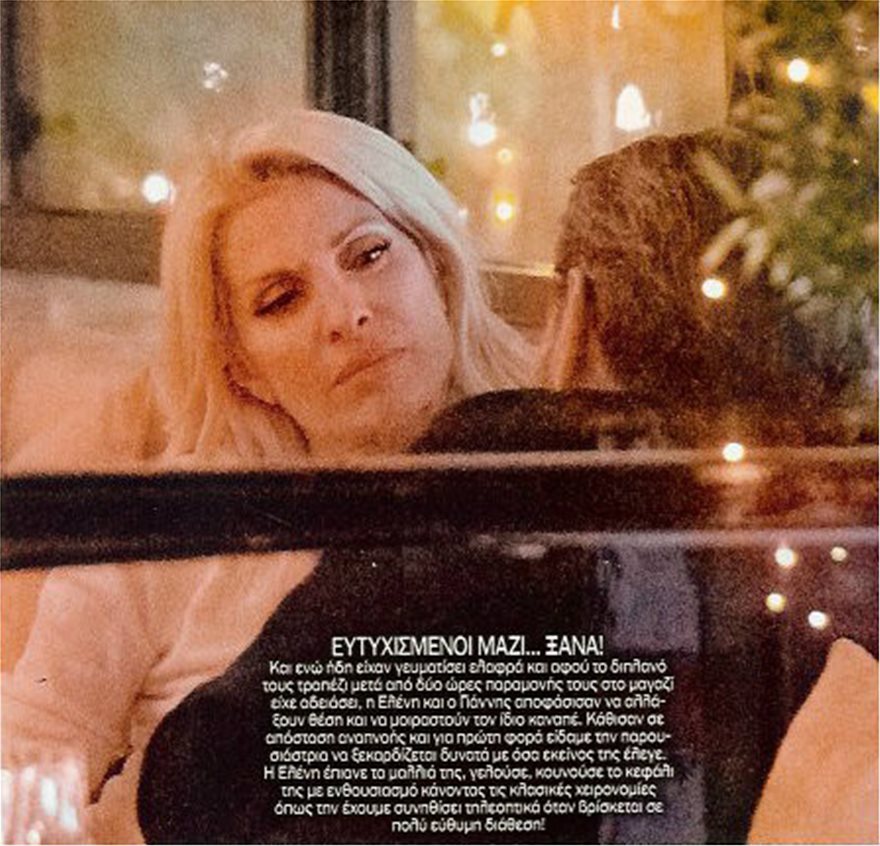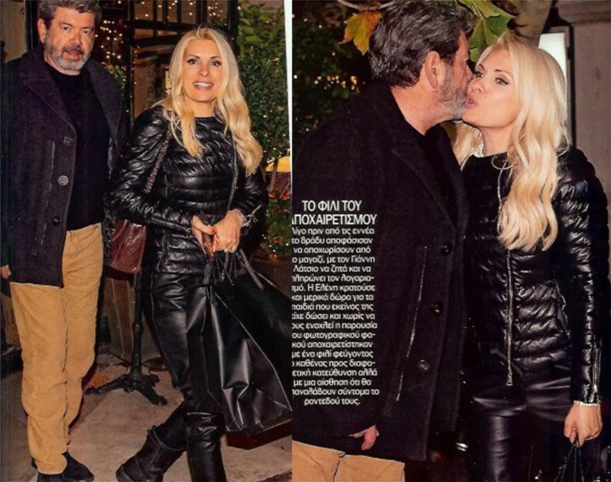 Την Ελένη Μενεγάκη και τον Γιάννη Λάτσιο εντόπισε ο φωτογραφικός φακός. Σε μια έξοδο τους σε γνωστό καφέ εστιατόριο της Κηφισιάς όπου και παρέμειναν για σχεδόν τρεις ώρες. Δέκα χρόνια μετά το συναινετικό τους διαζύγιο φαίνεται να διατηρούν καλές σχέσεις. Αφού είχαν αντιληφθεί τον φωτογράφο και δεν δίστασαν να μοιραστούν ένα αποχαιρετιστήριο φιλί.