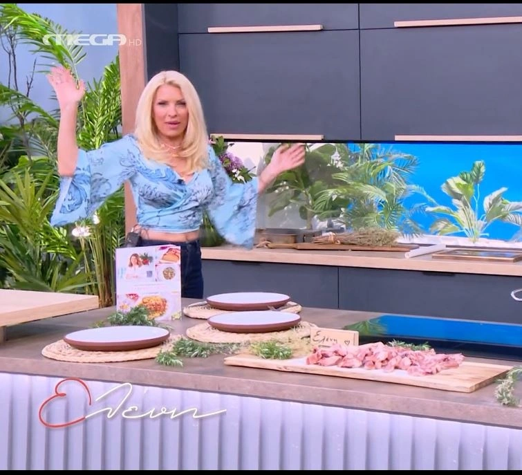 Η δημοφιλής παρουσιάστρια επέλεξε να φορέσει ένα τοπ σε απόχρωση γαλάζιου, το οποίο συνδύασε με τζιν παντελόνι. Κατά τη διάρκεια ενός χορού, η μπλούζα της ανέβηκε, αλλά δεν υπήρξε κανένα πρόβλημα, καθώς στα 54 της χρόνια και μετά από τέσσερις γέννες, διατηρεί την επίπεδη κοιλιά της!