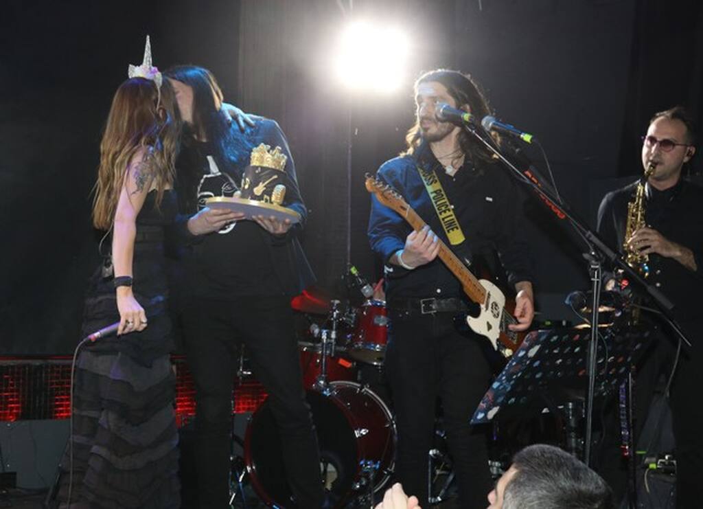 Συγκεκριμένα, όπως βλέπουμε από τις παρακάτω φωτογραφίες, ο γνωστός μουσικός εμφανίστηκε ξαφνικά επί σκηνής με μία εντυπωσιακή τούρτα στα χέρια και ζήτησε από την ερμηνεύτρια να σβήσει τα κεράκια.
