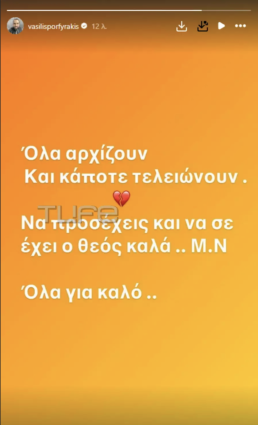 Στην ανάρτησή του, ο Βασίλης Πορφυράκης αναφέρει χαρακτηριστικά: «Όλα αρχίζουν και κάποτε τελειώνουν. Να προσέχεις και να σε έχει ο Θεός καλά Μ.Ν. Όλα για καλό».