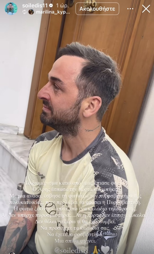 «Το διαμέρισμα κάτω από εμάς έπιασε φωτιά. Ο Άρης έσπασε την πόρτα και μπήκε. Με μία ανάσα, έσβησε την φωτιά με τον πυροσβεστήρα πολυκατοικίας, πριν προλάβει να φτάσει η πυροσβεστική. Η φωτιά ξεκίνησε απλά από ένα καλώδιο τηλεόρασης. Αν δεν υπήρχε πυροσβεστήρας… Αν η πόρτα δεν έσπαγε εύκολα… Δεν θέλω να ξέρω τι θα είχε συμβεί. Να προσέχετε τα καλώδια σας. Να έχετε πυροσβεστήρα. Μια σπίθα φτάνει» έγραψε η σύντροφος του Άρη Σοϊλετη στα μέσα κοινωνικής δικτύωσης παραχωρώντας ταυτόχρονα βίντεο από τη στιγμή που η φωτιά είχε σβήσει.