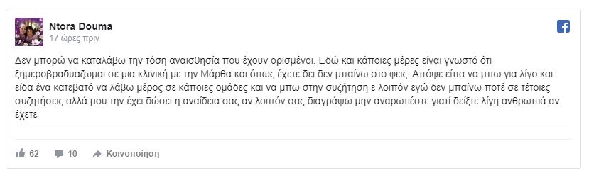 «Δεν μπορώ να καταλάβω την τόση αναισθησία που έχουν ορισμένοι. Εδώ και κάποιες μέρες είναι γνωστό ότι ξημεροβραδιάζομαι σε μια κλινική με την Μάρθα και όπως έχετε δει δεν μπαίνω στο φεις. Απόψε είπα να μπω για λίγο και είδα ένα κατεβατό να λάβω μέρος σε κάποιες ομάδες και να μπω στην συζήτηση ε λοιπόν εγώ δεν μπαίνω ποτέ σε τέτοιες συζητήσεις αλλά μου την έχει δώσει η αναίδεια σας αν λοιπόν σας διαγράψω μην αναρωτιέστε γιατί δείξτε λίγη ανθρωπιά αν έχετε».
