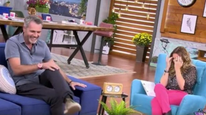 Μια σύντομη αναφορά από την παρουσιάστρια στο τηλεοπτικό ξεκίνημα του ηθοποιού στάθηκε ικανή να προκαλέσει μικρή αμηχανία μα και τα γέλια και των δυο τους.