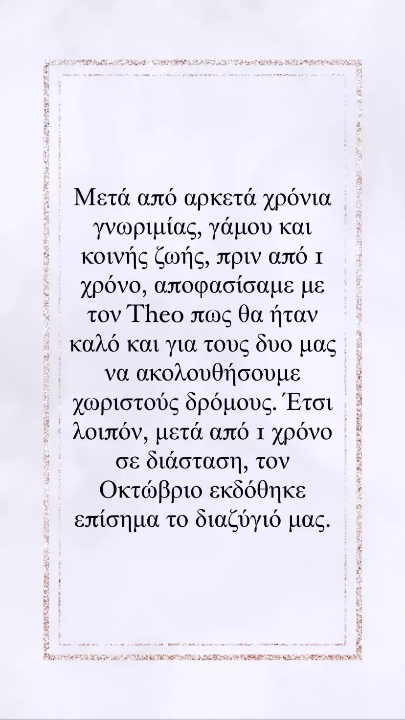 Μετά από αρκετά χρόνια γνωριμίας, γάμου και κοινής ζωής, πριν από έναν χρόνο αποφασίσαμε με τον Theo πως θα ήταν καλό και για τους δυο μας να ακολουθήσουμε χωριστούς δρόμους. Έτσι λοιπόν μετά από έναν χρόνο σε διάσταση τον Οκτώβριο εκδόθηκε επίσημα το διαζύγιό μας.