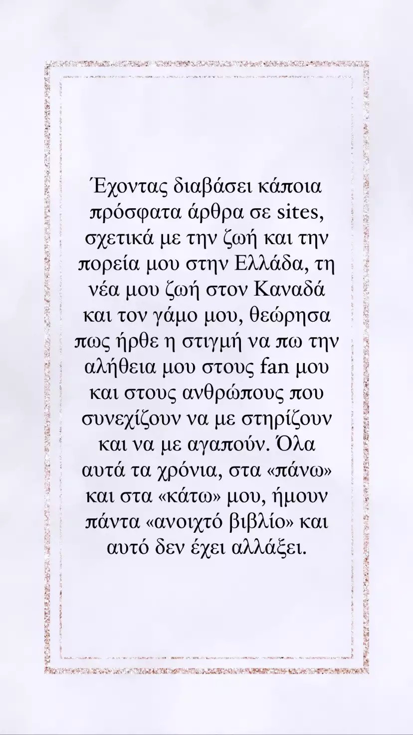 «Έχοντας διαβάσει κάποια πρόσφατα άρθρα σε sites, σχετικά με την ζωή και την πορεία μου στην Ελλάδα, τη νέα μου ζωή στον Καναδά και τον γάμο μου, θεώρησα πως ήρθε η στιγμή να πω την αλήθεια μου στους fans μου και στους ανθρώπους που συνεχίζουν να με στηρίζουν και να με αγαπούν. Όλα αυτά τα χρόνια στα πάνω μου και στα κάτω μου, ήμουν πάντα ανοιχτό βιβλίο και αυτό δεν έχει αλλάξει.