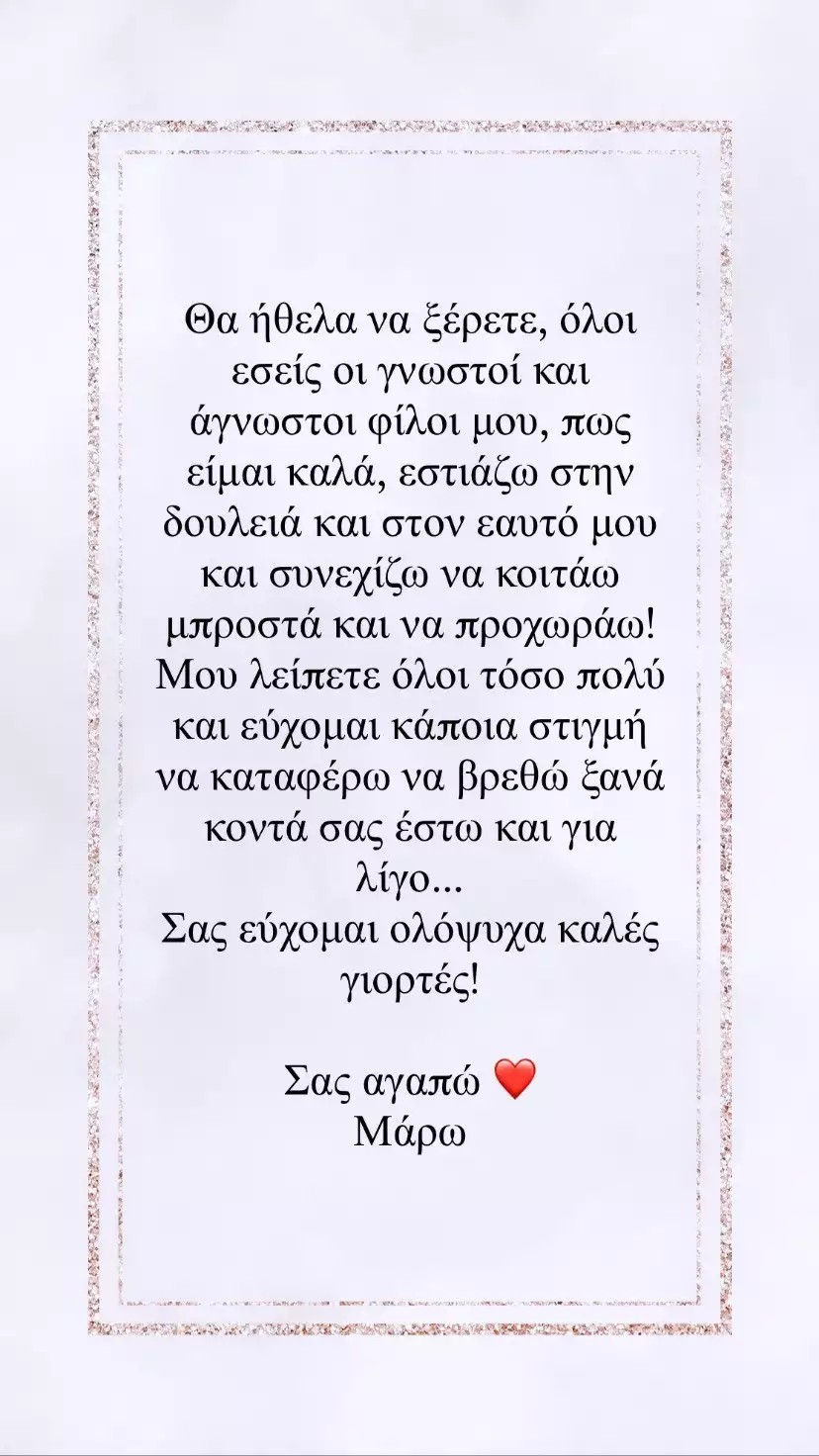Θα ήθελα να ξέρετε όλοι, εσείς οι γνωστοί και οι άγνωστοι φίλοι μου, πως είμαι καλά εστιάζω στη δουλειά και τον εαυτό μου και συνεχίζω να κοιτάω μπροστά και να προχωράω. Μου λείπετε όλοι τόσο και εύχομαι κάποια στιγμή να καταφέρω να βρεθώ ξανά κοντά σας έστω και για λίγο. Σας εύχομαι ολόψυχα καλές γιορτές. Σας αγαπώ. Μάρω»