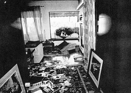 Το υπόλοιπο σκηνικό συνέθεταν τασάκια γεμάτα τσιγάρα, άδεια μπουκάλια από μπύρες και ουσίες στο τραπέζι του σαλονιού, ενώ τα πάντα μέσα στο διαμέρισμα του ηθοποιού ήταν αναποδογυρισμένα.