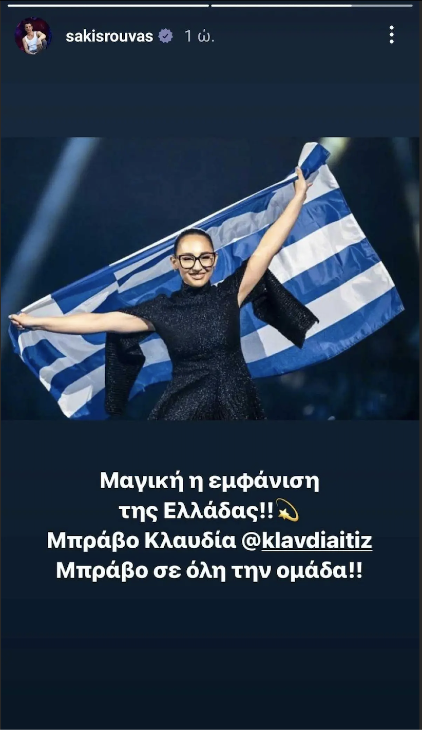 Ο δημοφιλής καλλιτέχνης ανέβασε Instagram story, γράφοντας χαρακτηριστικά: «Μαγική η εμφάνιση της Ελλάδας! Μπράβο Κλαυδία! Μπράβο σε όλη την ομάδα!», δείχνοντας έτσι δημόσια τη στήριξή του στην νεαρή τραγουδίστρια που κατάφερε να ξεχωρίσει με το ελληνόφωνο και ατμοσφαιρικό «Αστερομάτα».