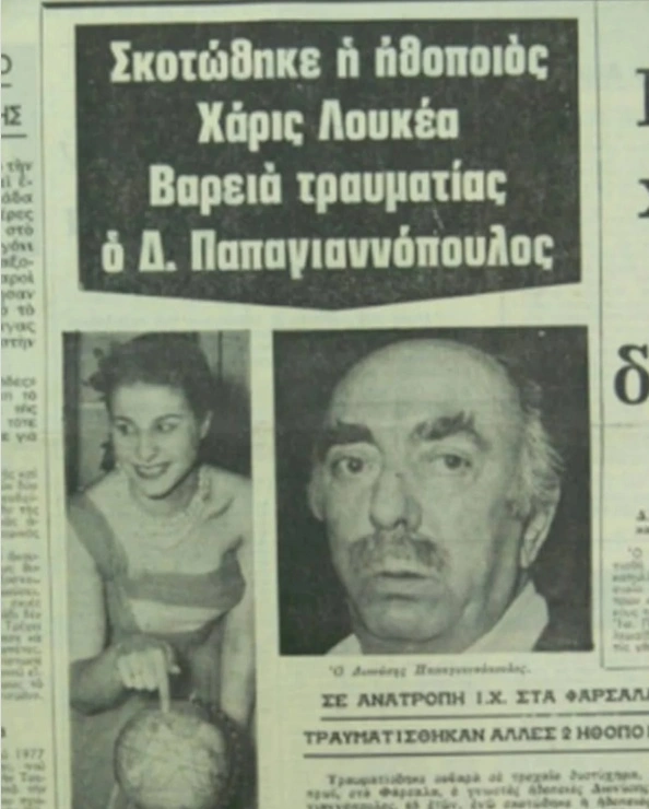 Μία από τις πιο δραματικές στιγμές στην ιστορία του ελληνικού θεάτρου εκτυλίχθηκε στις 13 Ιανουαρίου 1978, όταν τροχαίο δυστύχημα στοίχισε τη ζωή της ηθοποιού Χάρις Λουκέα και τραυμάτισε σοβαρά τον κορυφαίο πρωταγωνιστή Διονύση Παπαγιαννόπουλο, συγκλονίζοντας το πανελλήνιο.