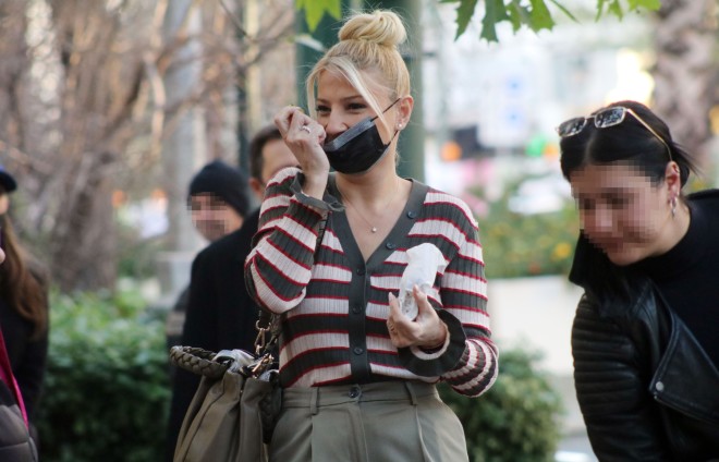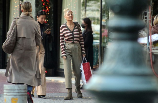 Ο φωτογραφικός φακός την απαθανάτισε να απολαμβάνει τη βόλτα της στο κέντρο της Αθήνας, φορώντας ριγέ ριμπ ζακέτα και cargo παντελόνι σε χακί τόνους.