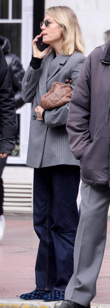 Συγκεκριμένα, φόρεσε ένα γκρι σταυροκούμπωτο μπλέιζερ, μαύρο τοπ και wide leg denim, αλλά το statement κομμάτι του outfit ήταν τα παπούτσια της. Πρόκειται για ένα ζευγάρι βελούδινα καπιτονέ μοκασίνια.