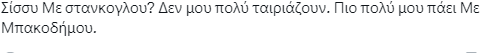 Κάτι ωστόσο, που πρόσθεσε μια χρήστης στο Twitter/X η οποία ήταν πολύ πιο παρατηρητική όσον αφορά τις δηλώσεις της Σταματίνας Τσιμτσιλή ανέφερε πως η παρουσιάστρια χρησιμοποίησε τη φράση «χαμογέλασε και πάλι» για τον Γιάννη Στάνκογλου ξεκινώντας την κουβέντα για την προσωπική του ζωή με την Σίσσυ Χρηστίδου να μπαίνει ισχυρά στο «κάδρο» της νέας συντρόφου του ηθοποιού, αφού η εκπομπή της έχει τίτλο Χαμογέλα και Πάλι!.