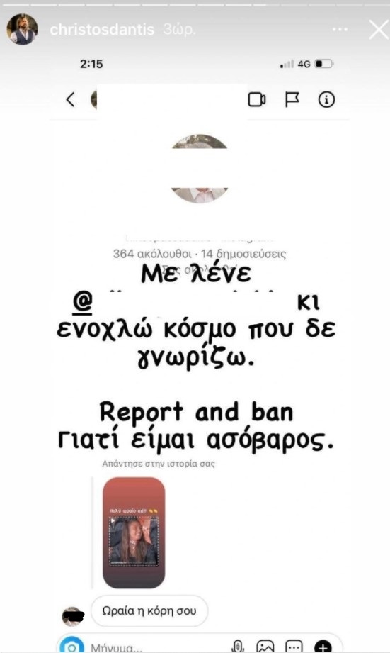 Ωστόσο, ο γνωστός τραγουδιστής ανέβασε στα stories του μερικά από τα αρνητικά μηνύματα που δέχεται από χρήστες του Instagram. «Ωραία η κόρη σου» γράφει ένας χρήστης, με τον καλλιτέχνη να απαντά: «Με λένε… και ενοχλώ κόσμο που δεν γνωρίζω. Report και ban γιατί είμαι ασόβαρος».