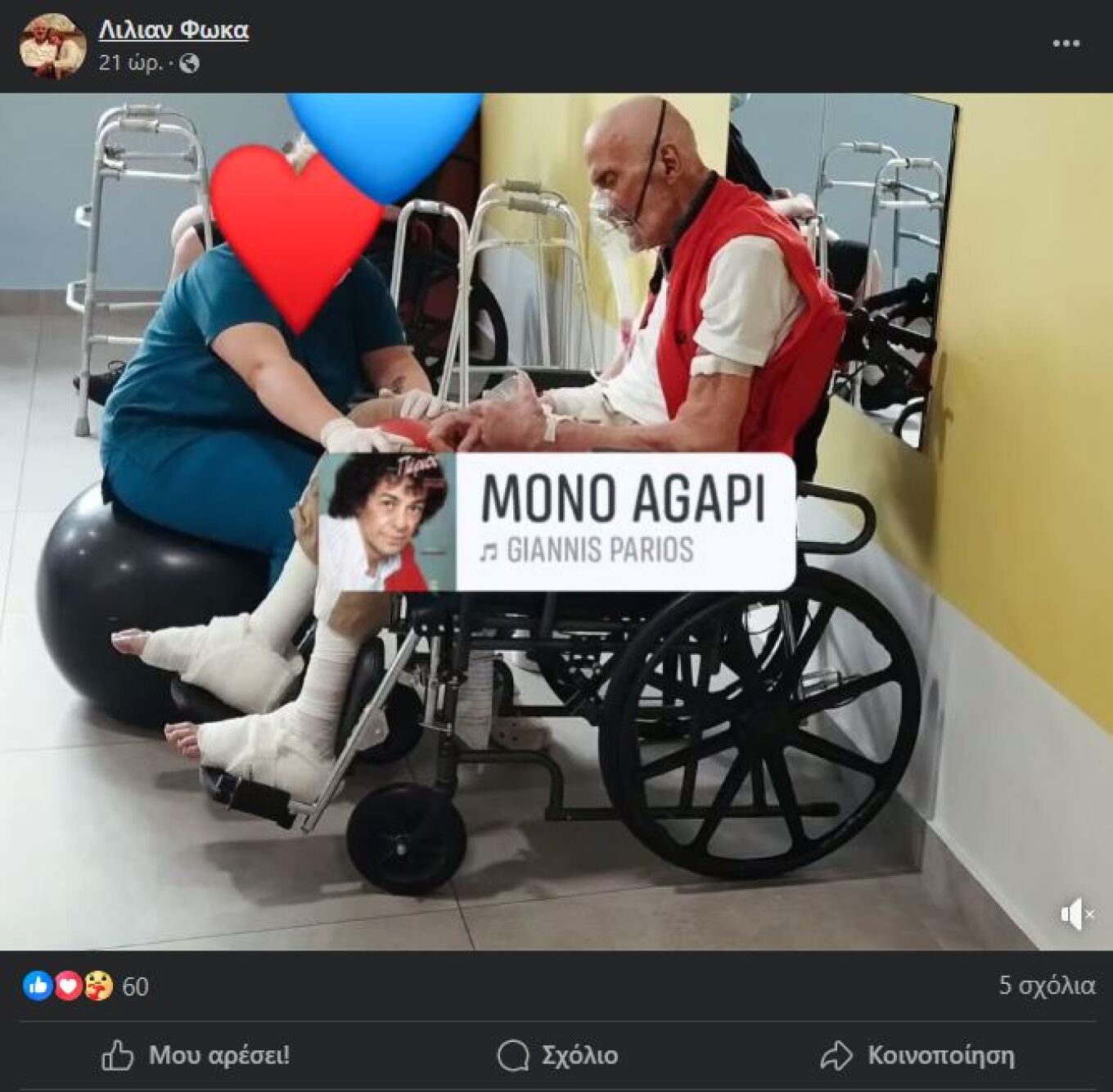 Στο προφίλ της συζύγου του στο facebook, υπάρχει μία φωτογραφία από το κρεβάτι του θεραπευτηρίου.