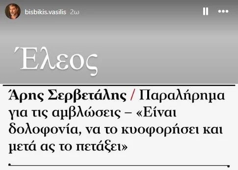 Με τον Βασίλη Μπισμπίκη να αναδημοσιεύει στον προσωπικό του λογαριασμό του στο instagram, ένα άρθρο που αφορούσε τις δηλώσεις του Άρη Σερβετάλη γράφοντας την λέξη «Έλεος».