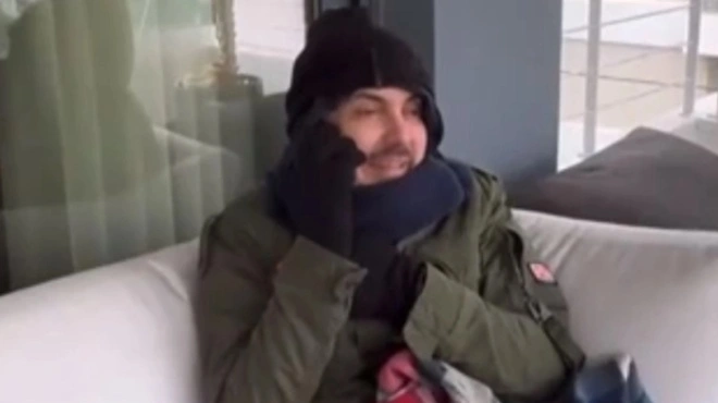Μια γυναίκα που ήταν μαζί του, τον κατέγραψε να προσπαθεί να αντέξει το το κρύο, αλλά ο Μιχάλης Χατζηγιάννης δείχνει να δυσκολεύεται, μιας και η θερμοκρασία φαίνεται πως ήταν αρκετά χαμηλή.