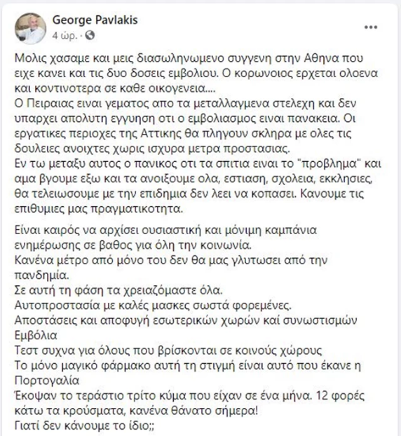 Ο κ. Παυλάκης αναφέρει μεταξύ άλλων ότι “δεν υπάρχει απόλυτη εγγύηση ότι ο εμβολιασμός είναι πανάκεια”, ενώ έκρουσε τον κώδωνα του κινδύνου για τις εργατικές περιοχές της Αθήνας και του Πειραιά, καθώς εκτίμησε πως “θα πληγούν σκληρά με όλες τις δουλειές ανοιχτές χωρίς ισχυρά μέτρα προστασίας”.