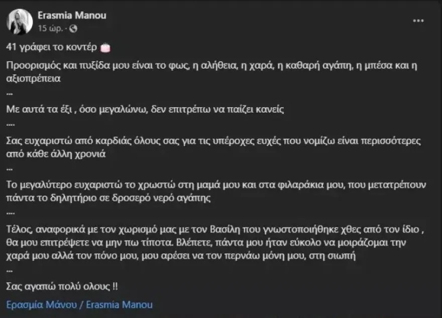 Ενώ νωρίτερα και ο Βασίλης Δημάκης έγραψε στον προσωπικό του λογαριασμό στο Facebook: «Την Τρίτη 20/02/2024 το απόγευμα, σε προκαθορισμένο ραντεβού που κλείστηκε σήμερα έχω καλέσει τον συμβολαιογράφο κύριο Αντώνιου, έτσι ώστε να προβούμε στη λύση του συμφώνου συμβίωσης το οποίο είχαμε συνάψει με την κυρία Ερασμία Μανού πρώην σύντροφο μου!».