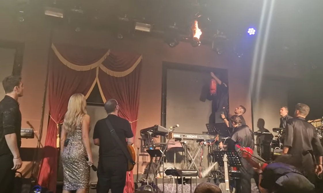 Πιο συγκεκριμένα την ώρα που οι 2 καλλιτέχνες τραγουδούσαν στη σκηνή, στο σημείο πίσω ακριβώς από την ορχήστρα ξέσπασε φωτιά στην οροφή από μια λάμπα. Όπως ήταν λογικό το πρόγραμμα διακόπηκε προκειμένου να δούνε τι θα έκαναν με τη φωτιά.