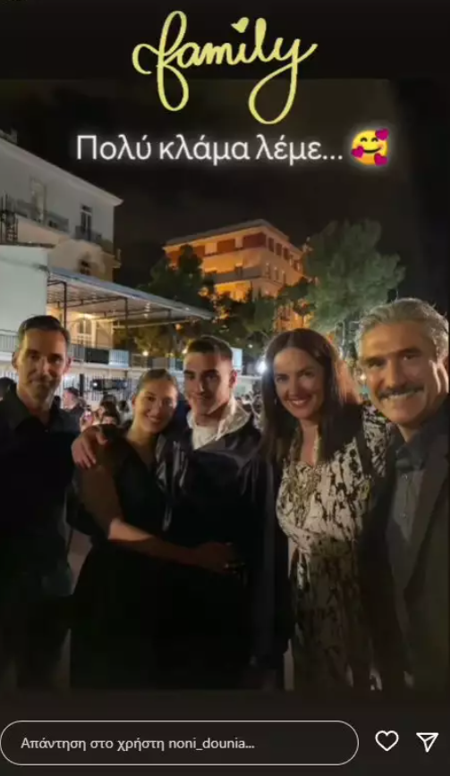 «Πολύ κλάμα λέμε» έγραψε στην οικογενειακή φωτογραφία η Νόνη Δούνια δηλώνοντας έτσι τη συγκίνησή της για τον γιο της ο οποίος ξεκινά ένα νέο κεφάλαιο στη ζωή του, μετά το σχολείο.