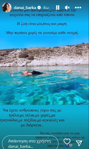 «Κορίτσια μου πανέμορφα μην αφήνετε την ψυχούλα σας να επηρεάζεται από τίποτα. Η ζωή είναι μια, ίσως και μικρή. Μην περάσει χωρίς να γευτούμε κάθε στιγμή. Να έχετε ανθρώπους γύρω σας με γέλια, τρέλα, χαρές, με ταξίδια, με αγκαλιές και με διάρκεια. Να σας αγαπάτε και να μην αφήσετε κανέναν να σας κάνει να πιστέψετε ότι δεν μπορείτε να κάνετε κάτι», έγραψε.