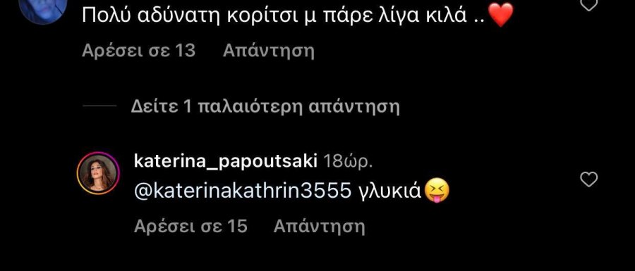 Τα άσχημα σχόλια ποικίλαν με τα πιο κλασσικά όπως “Πολύ αδύνατη κορίτσι μ πάρε λίγα κιλά ..❤️” μέχρι και σχόλια για το αν φταίει ένας χωρισμός για το σώμα της και τα κιλά της