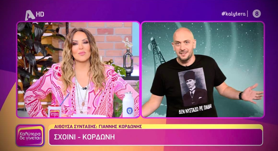 Ο συνεργάτης της εκπομπής της Ναταλίας Γερμανού, Γιάννης Κορδώνης και με αφορμή της εκλογές στην γείτονα Τουρκία επέλεξε να φορέσει μια μπλούζα η οποία ξεσήκωσε έντονες αντιδράσεις. Πιο συγκεκριμένα θέλοντας να σατιρίσει το αποτέλεσμα των εκλογών στην Τουρκία και με αφορμή το τραγούδι Κεμάλ του Μάνου Χατζιδάκι και την ατάκα “Καληνύχτα Κεμάλ” η οποία και ακούστηκε αρκετά τις τελευταίες μέρες επέλεξε να φορέσει μια μπλούζα με τον Κεμάλ Ατατούρκ γράφοντας τη λεζάντα “δεν νυστάζω ρε παιδιά”.