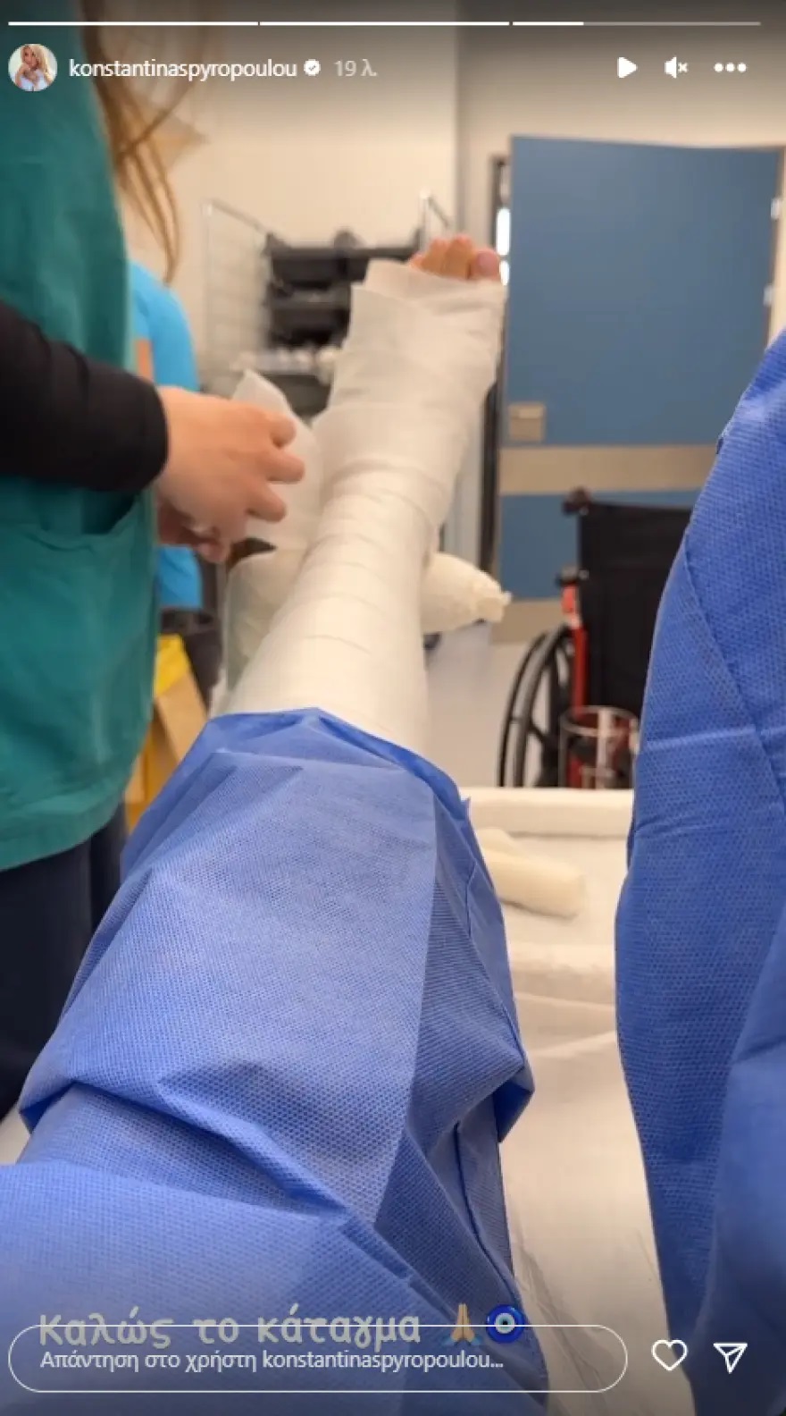 Συγκεκριμένα, ανάρτησε ένα στιγμιότυπο μέσα από το νοσοκομείο, στο οποίο οι γιατροί φαίνονται να «δένουν» το αριστερό της πόδι.