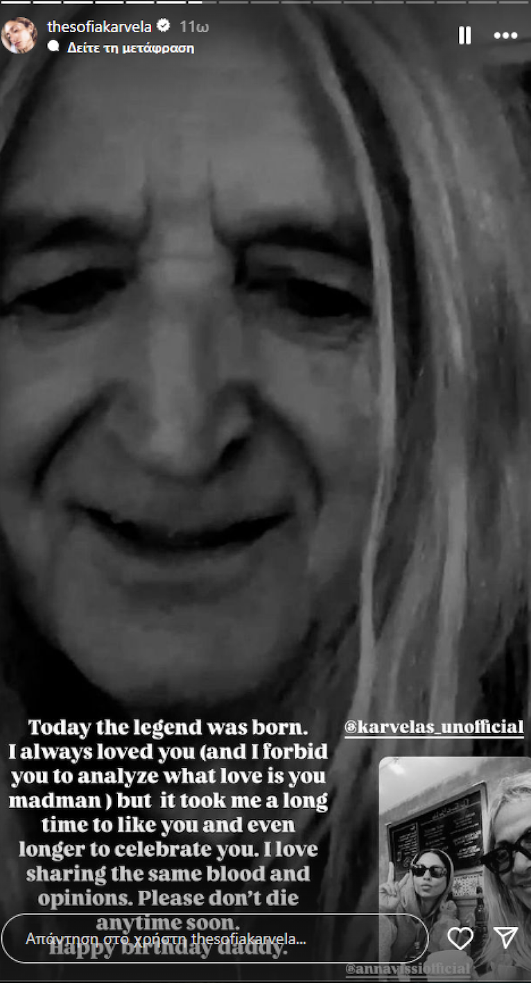 Το μήνυμα της Σοφίας στον Νίκο Καρβέλα, κατέληξε ως εξής: «Σε παρακαλώ, μην πεθάνεις σύντομα. Χαρούμενα γενέθλια μπαμπά».