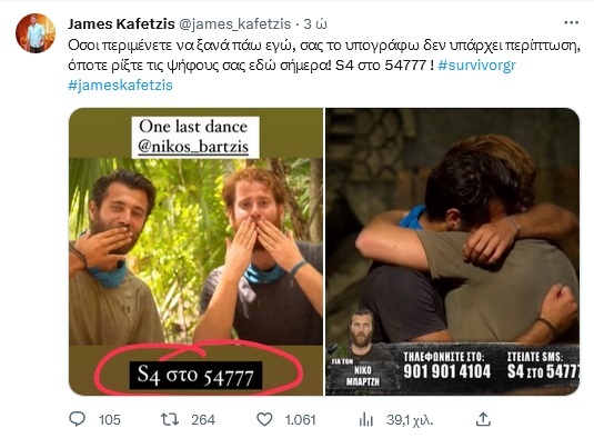 Ο Τζέιμς πάντως στα social στήριξε τον Μπάρτζη τόσο στον ημιτελικό όσο και στον τελικό και ζήτησε από τους followers να στηρίξουν τον Νίκο Μπάρτζη ενώ, ο ίδιος δεν πρόκειται να ξαναπάει, βάζοντας έτσι τέλος στα σενάρια που ήθελαν τον Ατζούν Ιλιτζαλί να τον πολιορκεί και πάλι για να επιστρέψει στο Survivor All Star 2!