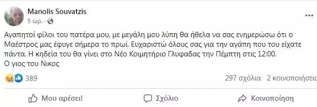 Ειδικότερα, ο Νίκος Σουβατζής ενημέρωσε πως ο πατέρας του έφυγε από τη ζωή με μια ανάρτηση μέσα από τον λογαριασμό του Μανώλη Σουβατζή στο Facebook,.