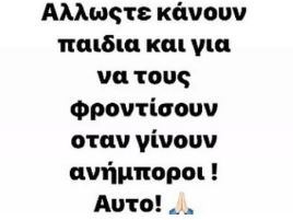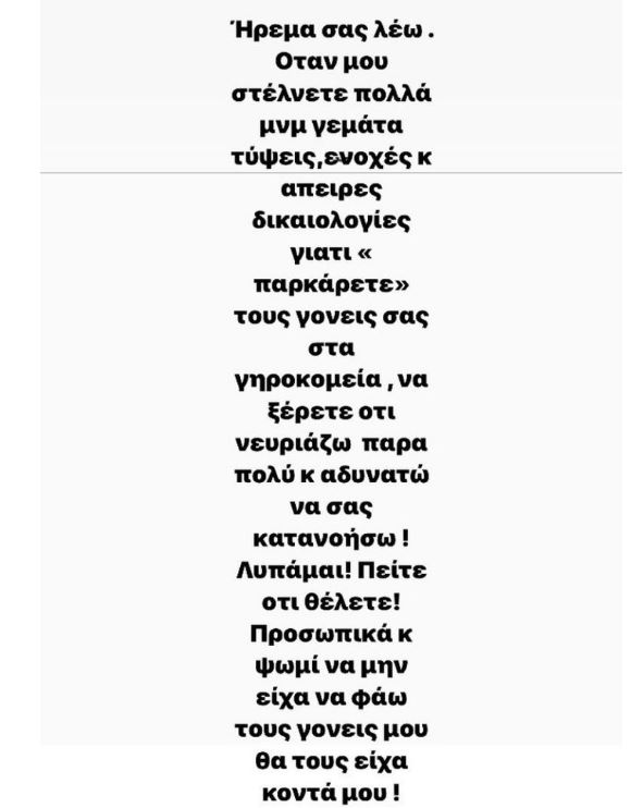 Η αγαπημένη παροσίαστρια με αυστηρό ύφος έγραψε: Ήρεμα σας λέω. Όταν μου στέλνετε πολλά μηνύματα γεμάτα τύψεις ενοχές και άπειρες δικαιολογίες γιατί «παρκάρετε» τους γονείς σας στα γηροκομεία να ξέρετε ότι νευριάζω πάρα πολύ και αδυνατώ να σας κατανοήσω. Πείτε ότι θέλετε. Εγώ και ψωμί να μην είχα να φάω τους γονείς μου θα τους είχα κοντά μου. Άλλωστε κάνουν παιδιά και για να τους φροντίσουν όταν είναι ανήμποροι! Αυτό!».