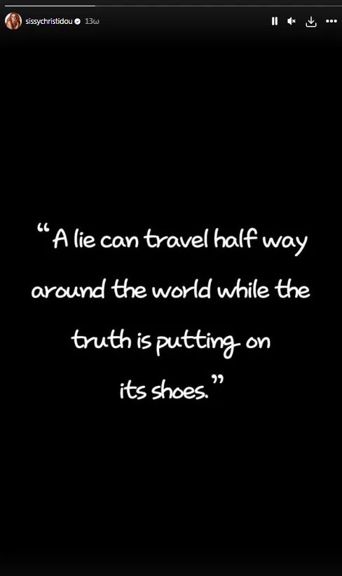 Η Σίσσυ Χρηστίδου, μετά τις φήμες περί σχέσης με τον Γιάννη Στάνκογλου, αντέδρασε με μια ανάρτηση στο Instagram. Στο story που ανέβασε, έγραψε: “Ένα ψέμα κάνει τον μισό γύρο του κόσμου, μέχρι η αλήθεια να φορέσει τα παπούτσια της.” Με αυτόν τον τρόπο, η παρουσιάστρια διαψεύδει τις φήμες και εκφράζει την άποψή της για τα σχόλια που έχουν κυκλοφορήσει.