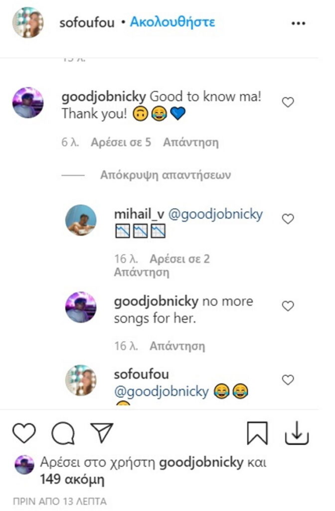 Βέβαια το εν λόγω σχόλιο προκάλεσε την αντίδραση του Good Job Nicky, ο οποίος φαίνεται να… ζήλεψε την προτίμηση που έδειξε η μητέρα του στον αδερφό του και της απάντησε «ευχαριστώ μαμά, δεν έχει άλλα τραγούδια για σένα!»