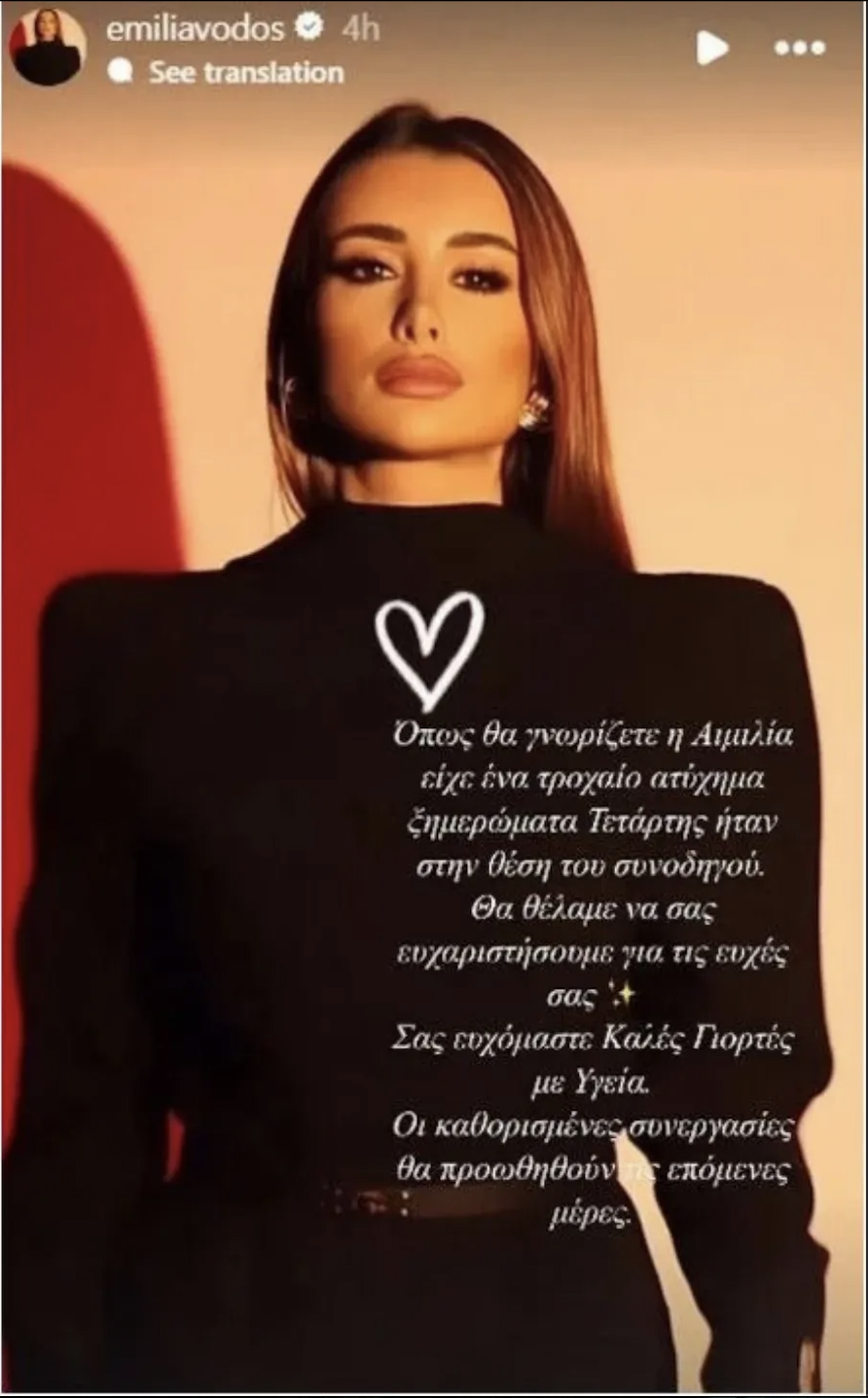 «Όπως θα γνωρίζετε, η Αιμιλία είχε ένα τροχαίο ατύχημα ξημερώματα Τετάρτης και ήταν στη θέση του συνοδηγού. Θα θέλαμε να σας ευχαριστήσουμε για τις ευχές σας. Σας ευχόμαστε καλές γιορτές με υγεία. Οι καθορισμένες συνεργασίες θα προωθηθούν τις επόμενες ημέρες».