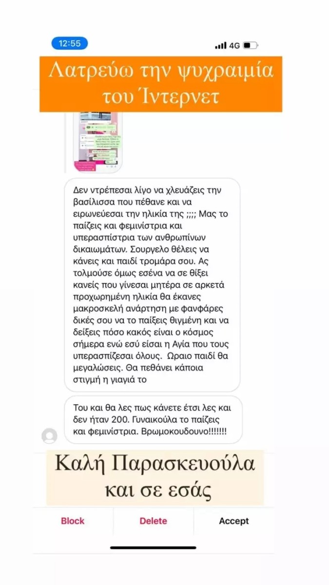«Δεν ντρέπεσαι λίγο να χλευάζεις την βασίλισσα που πέθανε για την ηλικία της; Μας το παίζεις και φεμινίστρια και υπερασπίστρια των ανθρώπινων δικαιωμάτων. Σούργελο θέλεις να κάνεις και παιδί τρομάρα σου. Ας τολμούσε όμως εσένα να σε θίξει κανείς που γίνεσαι μητέρα σε αρκετά προχωρημένη ηλικία θα έκανες μακροσκελή ανάρτηση με φανφάρες δικές σου να το παίξεις θιγμένη και να δείξεις πόσο κακός είναι ο κόσμος σήμερα ενώ εσύ είσαι η Αγία που τους υπερασπίζεσαι όλους. Ωραίο παιδί θα μεγαλώσεις…» έγραφε χαρακτηριστικά το μήνυμα που έλαβε στα DM της.