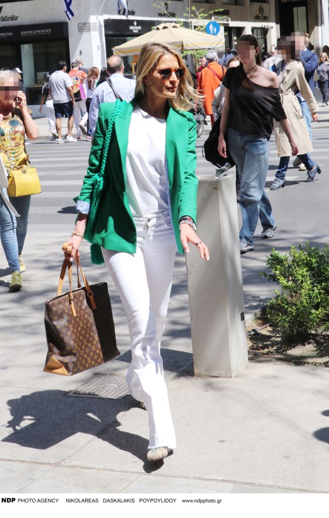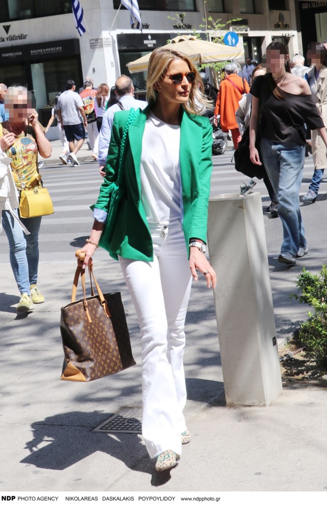 Η ίδια ήταν στιλάτη, επιλέγοντας λευκό παντελόνι, τοπ, ένα πράσινο σακάκι και έθνικ μπαλαρίνες, ενώ κρατούσε μια τσάντα Louis Vuitton και μια πράσινη πλεκτή τσάντα ώμου στην ίδια απόχρωση με το σακάκι της.